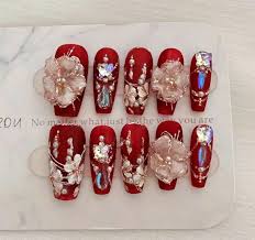 Luxury Red Press-On Nails with 3D Floral and Rhinestone Accents